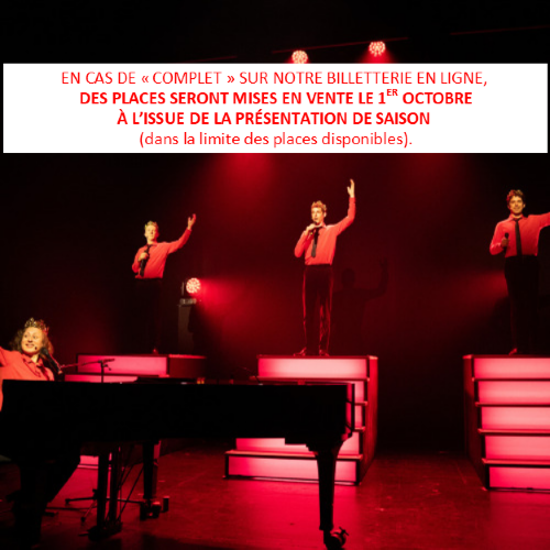 DANS LE CAS OÙ LE SPECTACLE AFFICHERAIT COMPLET SUR NOTRE BILLETTERIE EN LIGNE, DES PLACES SERONT MISES EN VENTE LE 1ER OCTOBRE LE SOIR DE LA PRÉSENTATION DE SAISON (dans la limite des places disponibles).